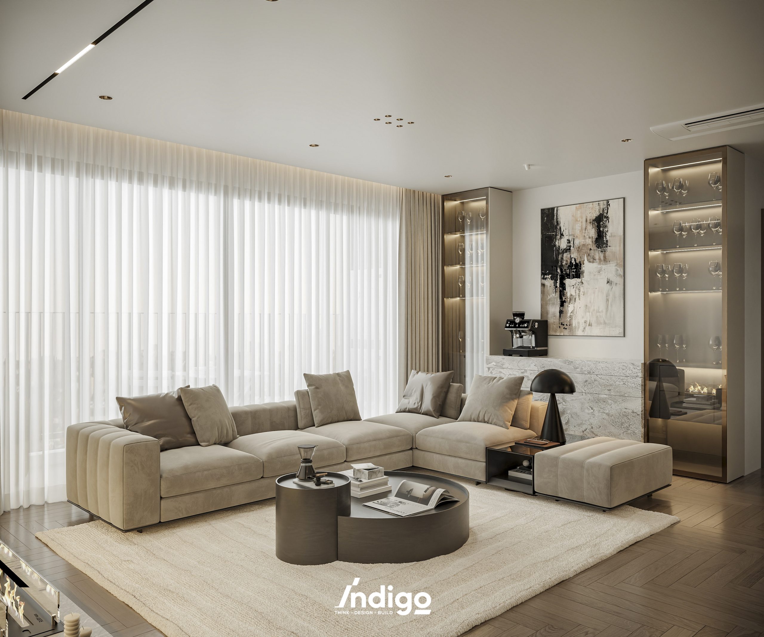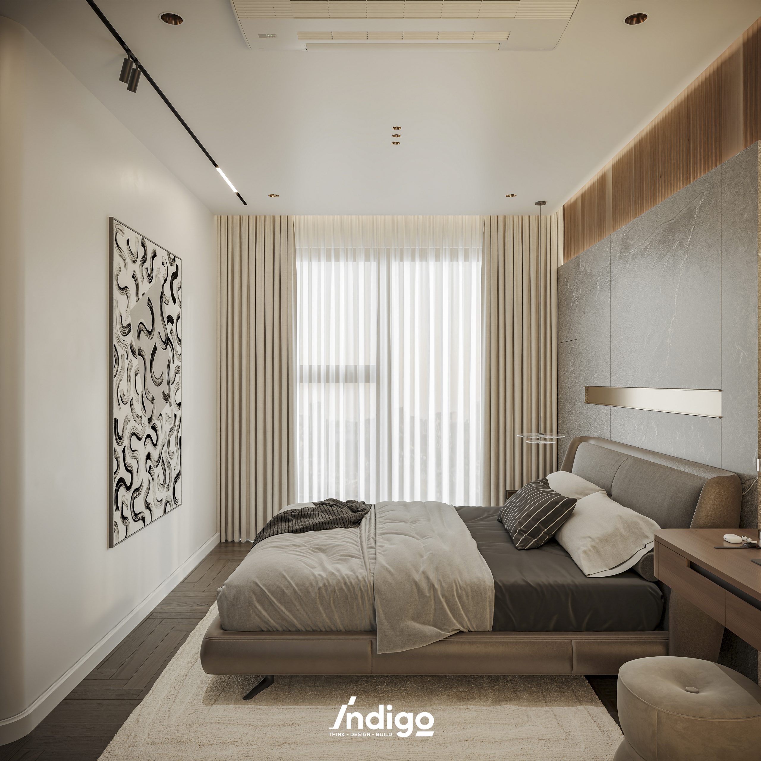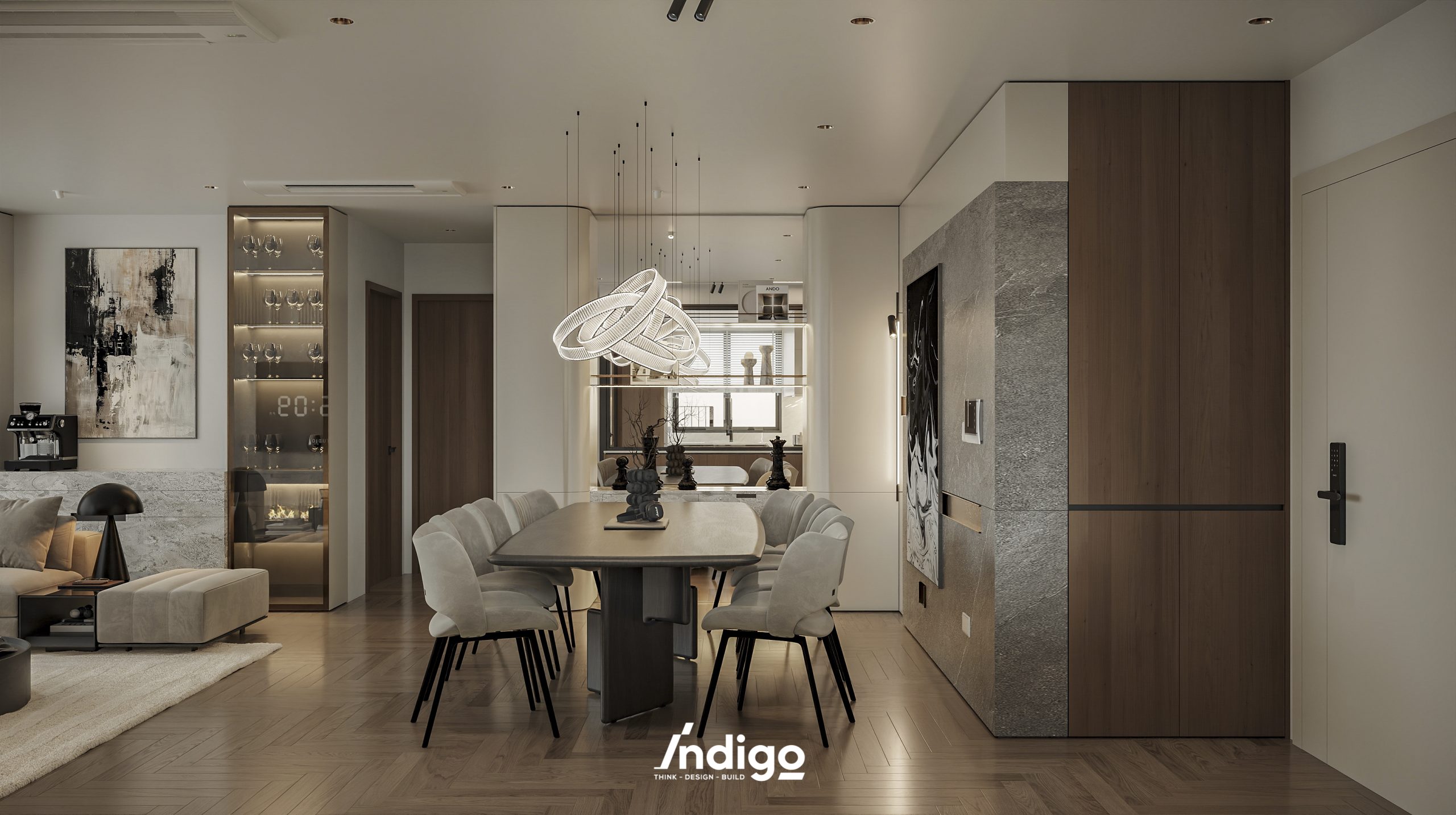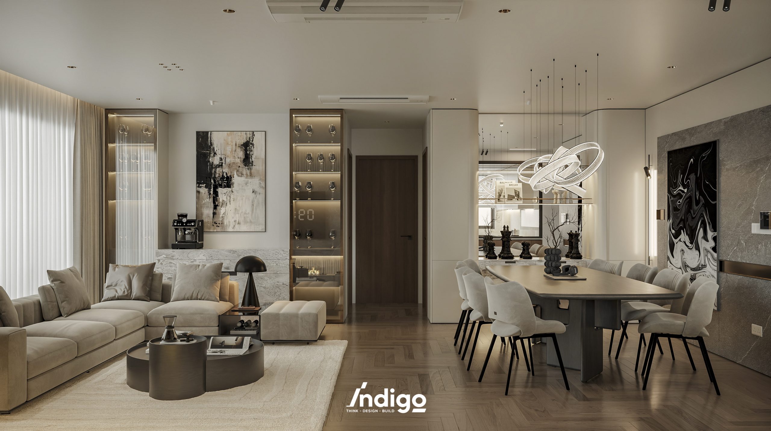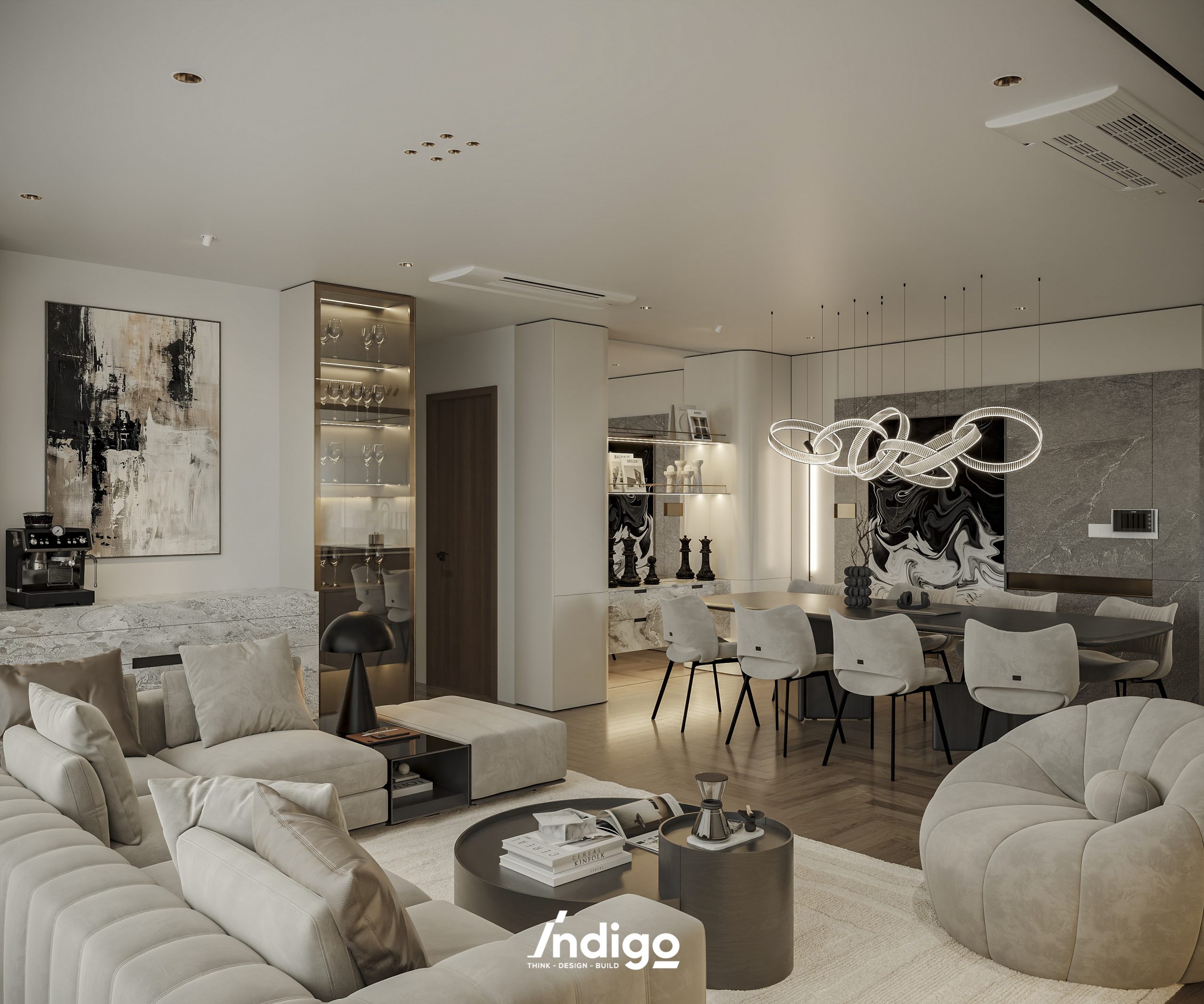 Một không gian sống hoàn chỉnh mang bầu không khí vừa riêng tư, vừa cởi mở. Màu trung tính kết hợp be nhám, đen than với điểm nhấn kim loại, da và gỗ tạo cảm giác tĩnh tâm, thư thái.