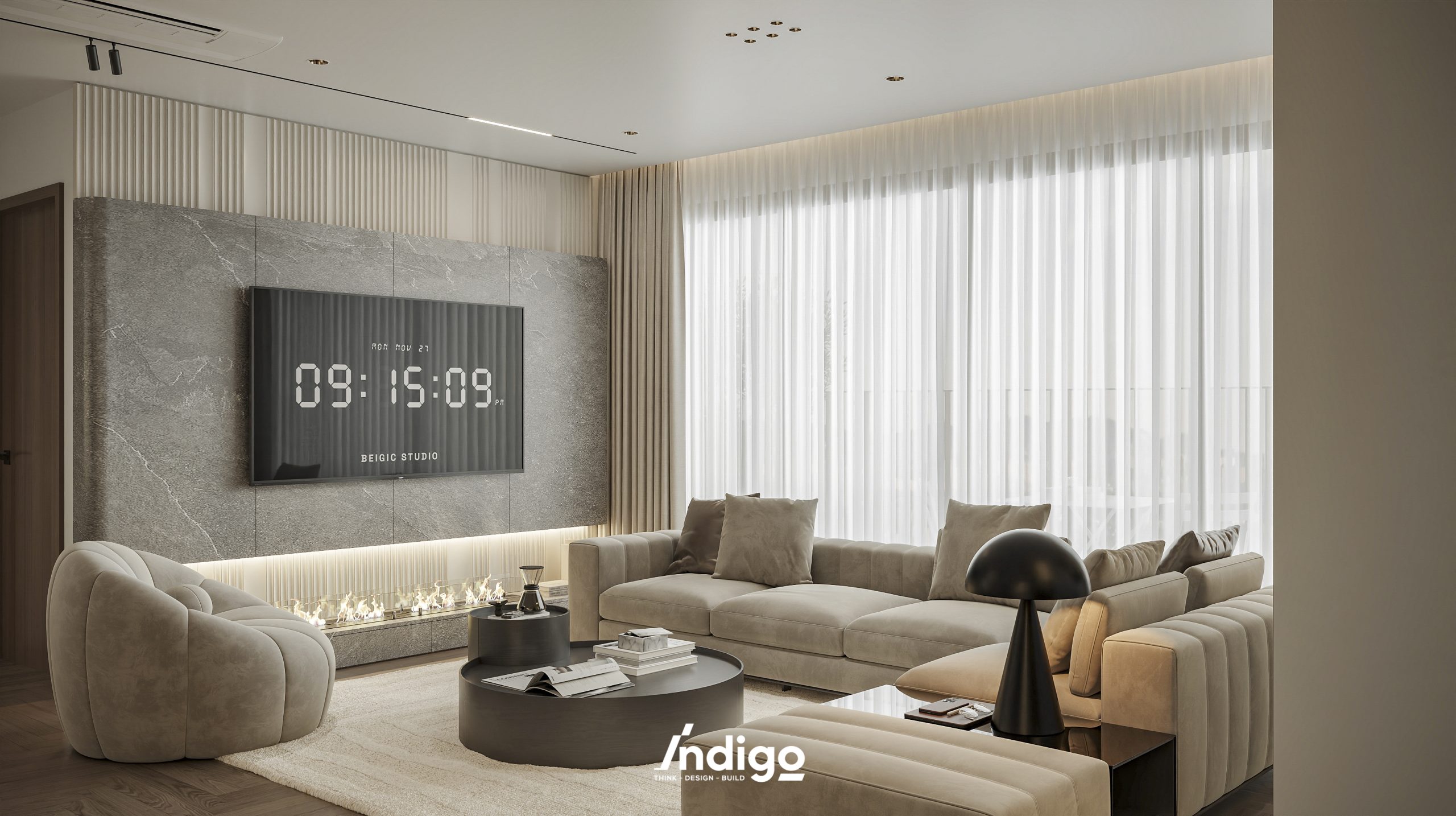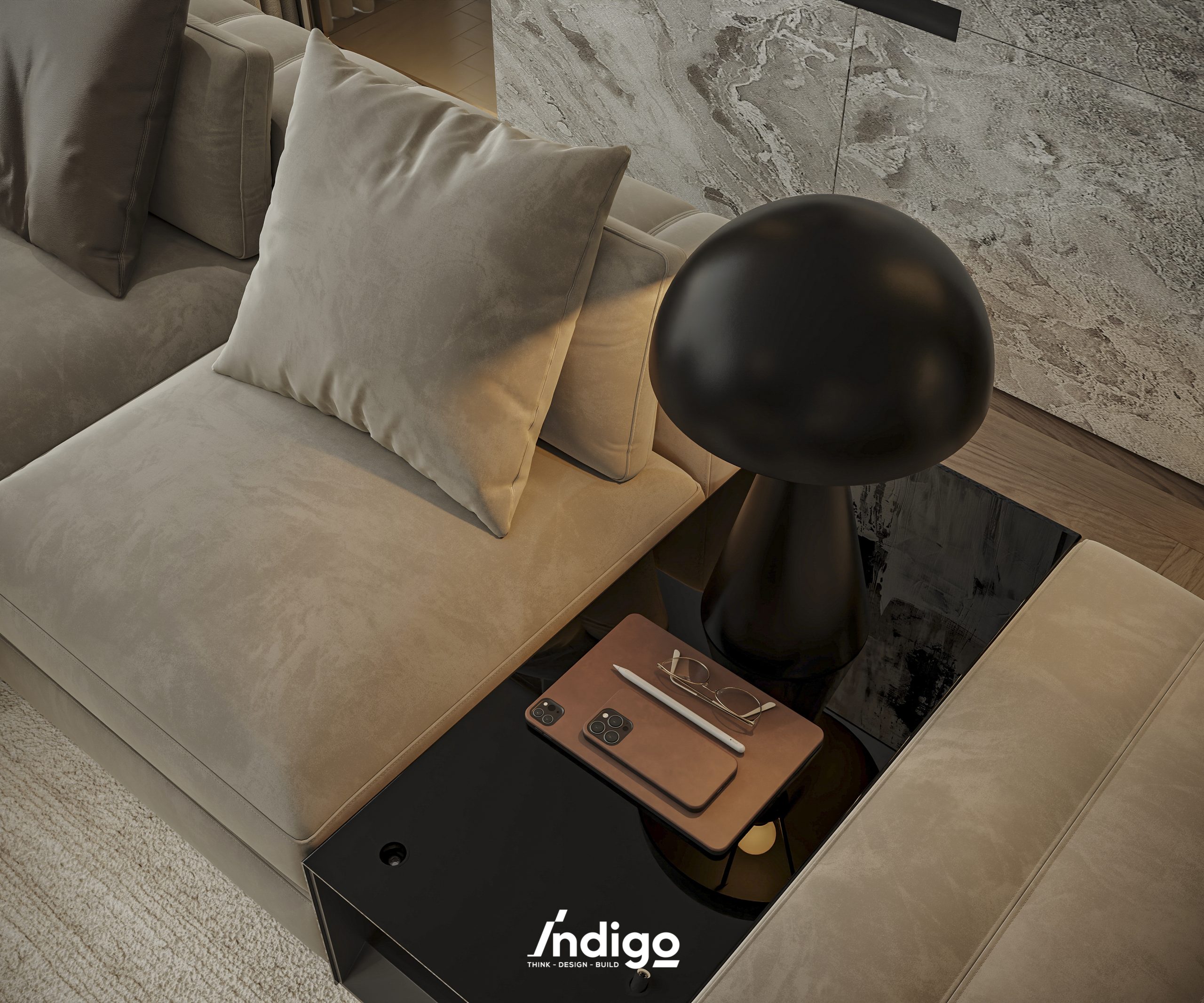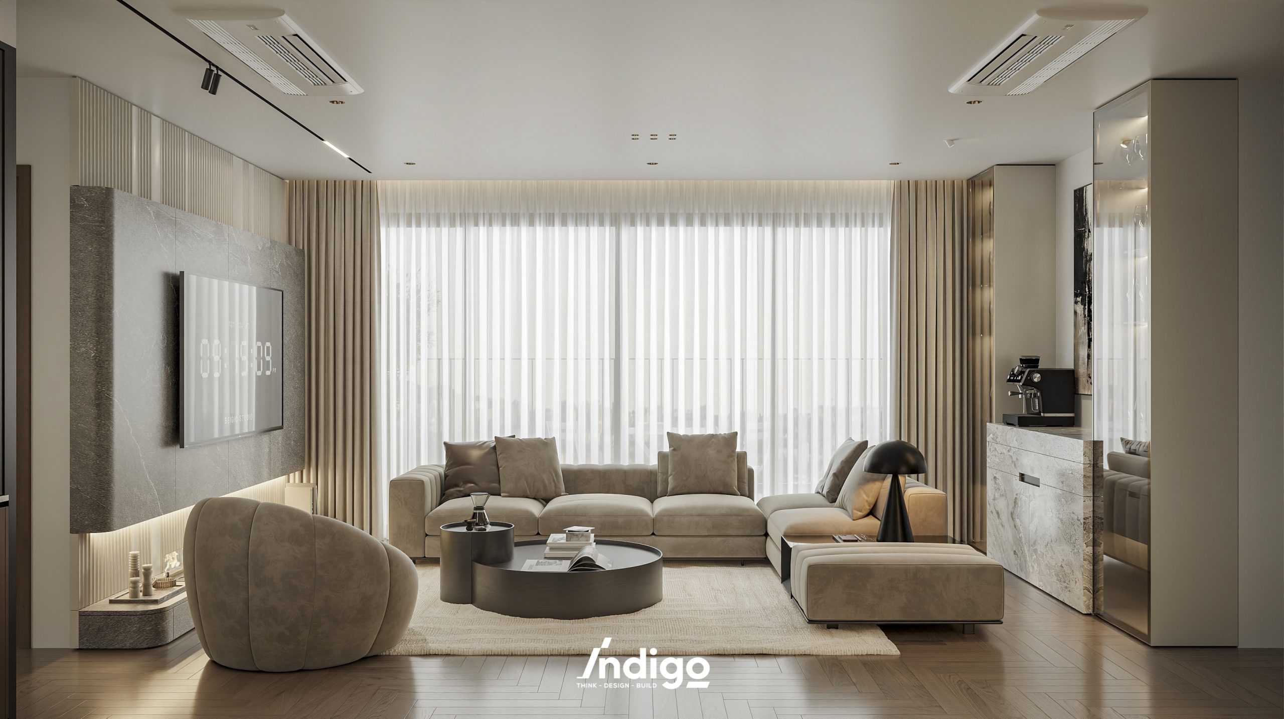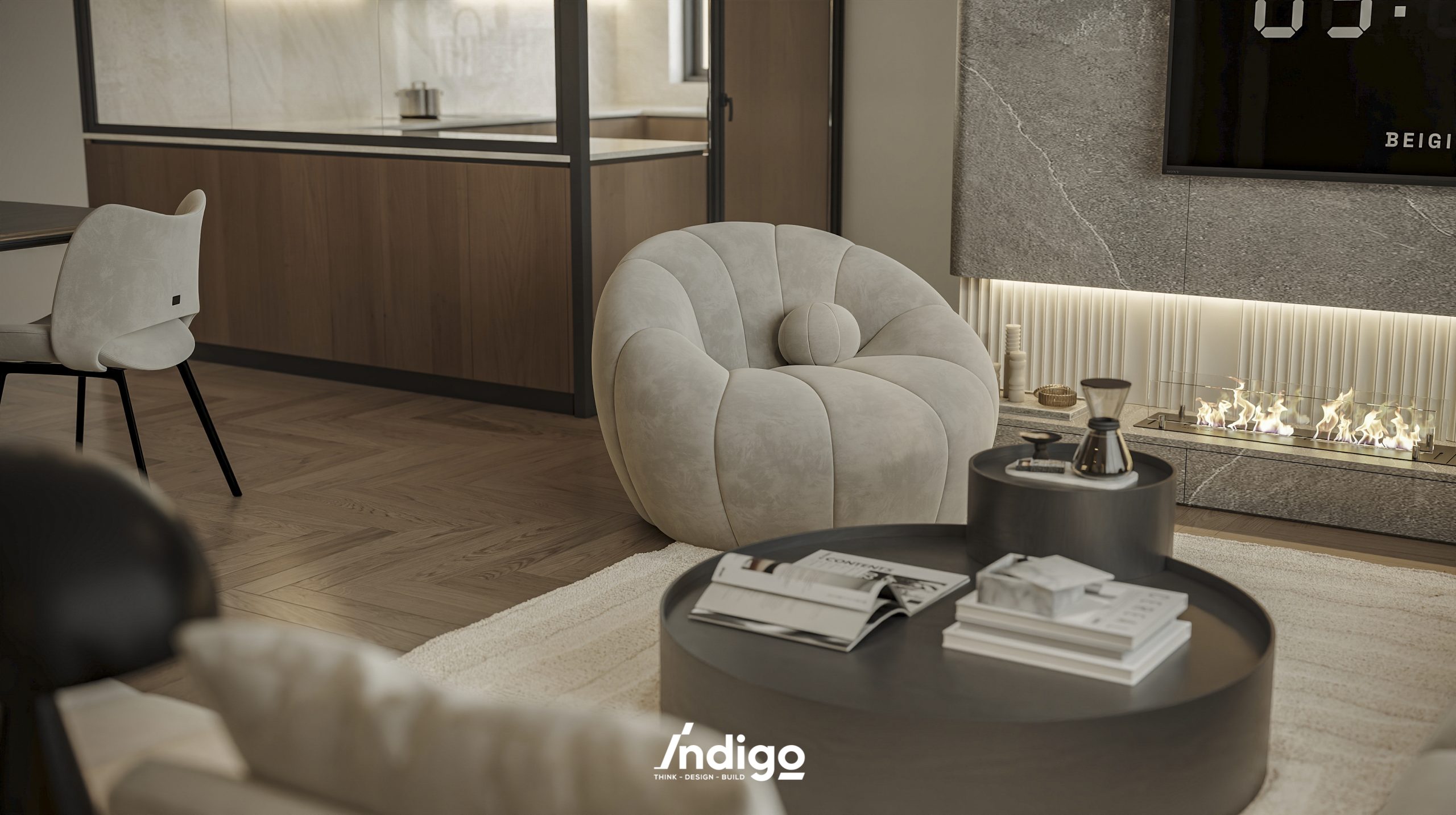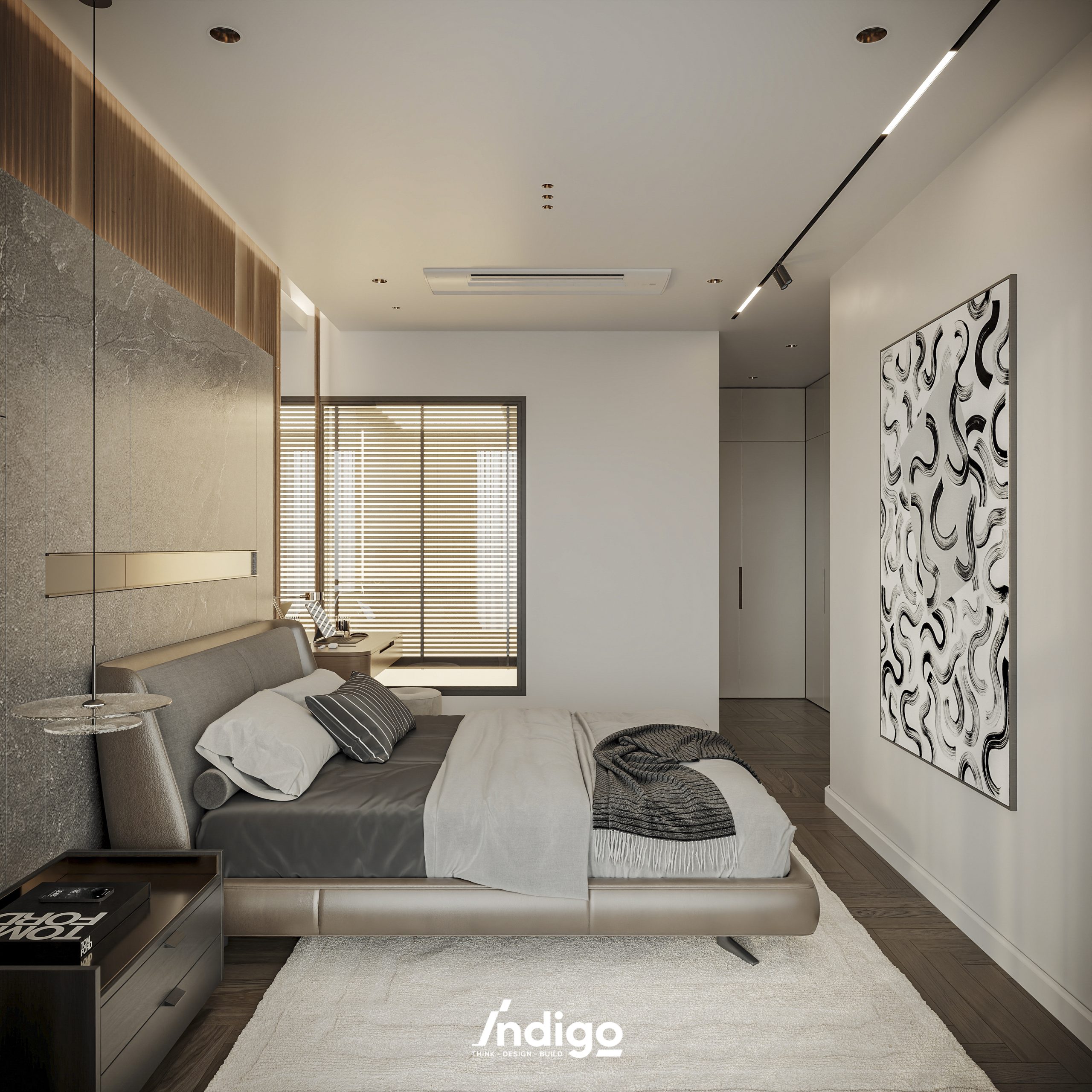 Một không gian sống hoàn chỉnh mang bầu không khí vừa riêng tư, vừa cởi mở. Màu trung tính kết hợp be nhám, đen than với điểm nhấn kim loại, da và gỗ tạo cảm giác tĩnh tâm, thư thái.