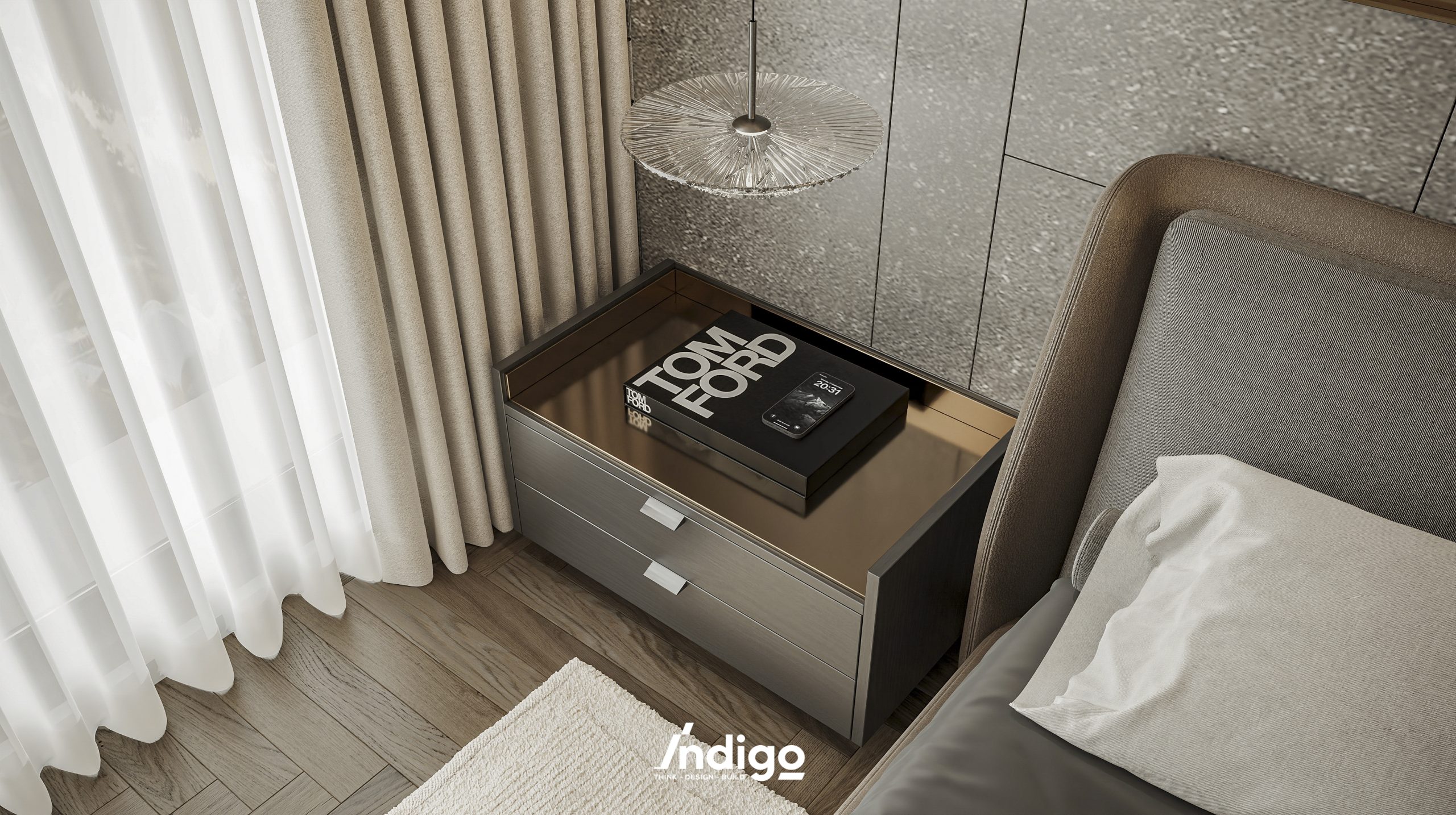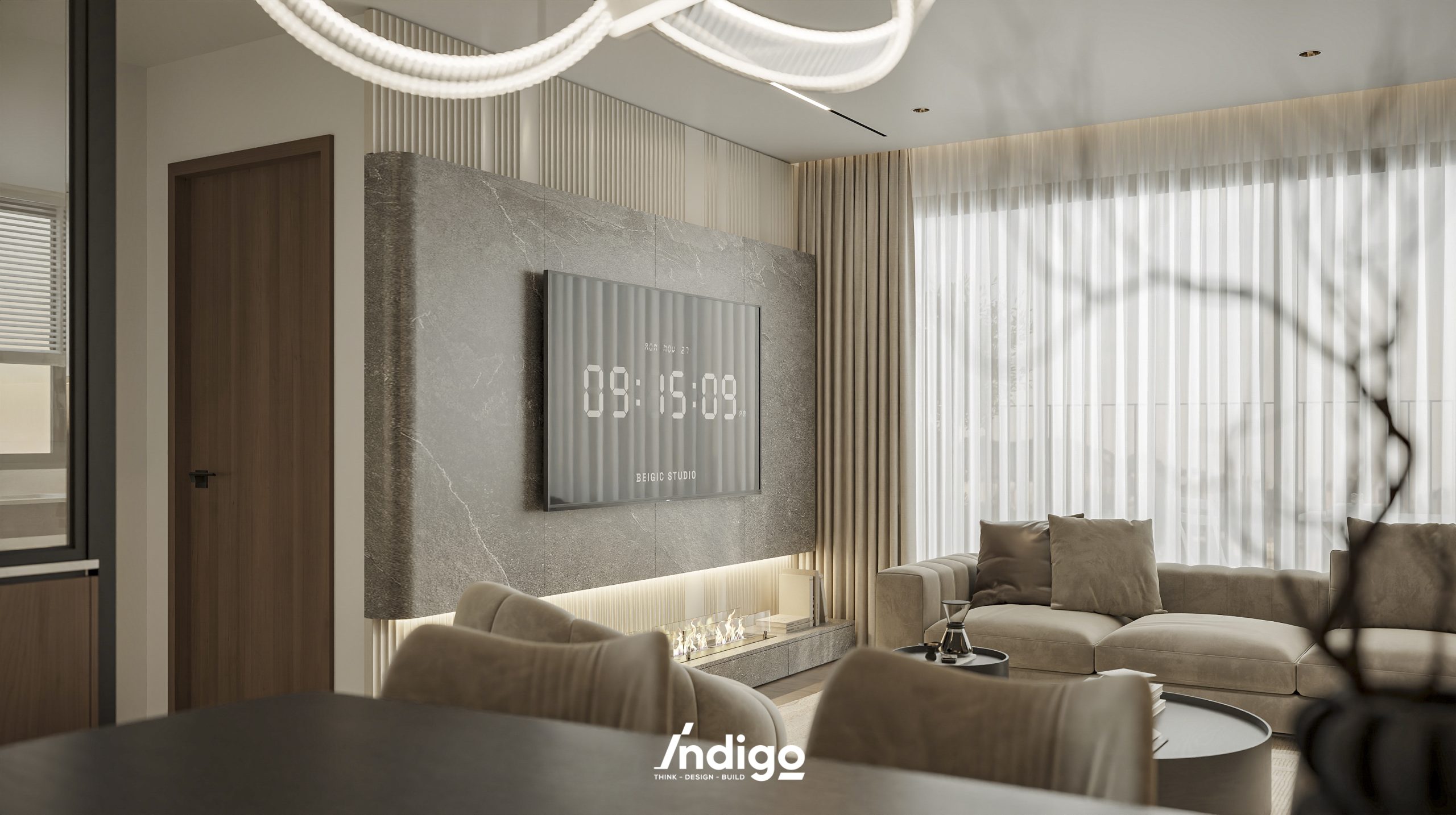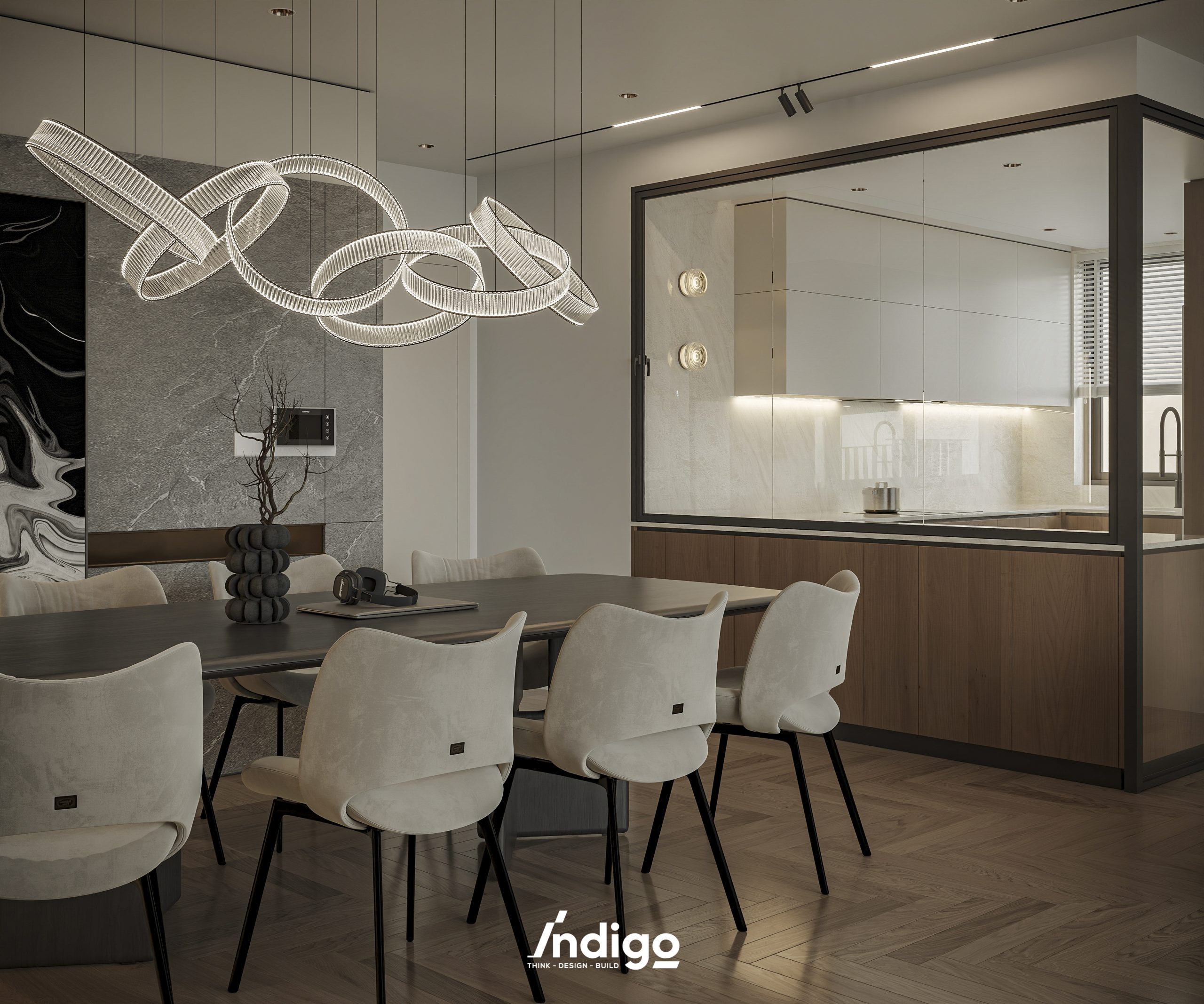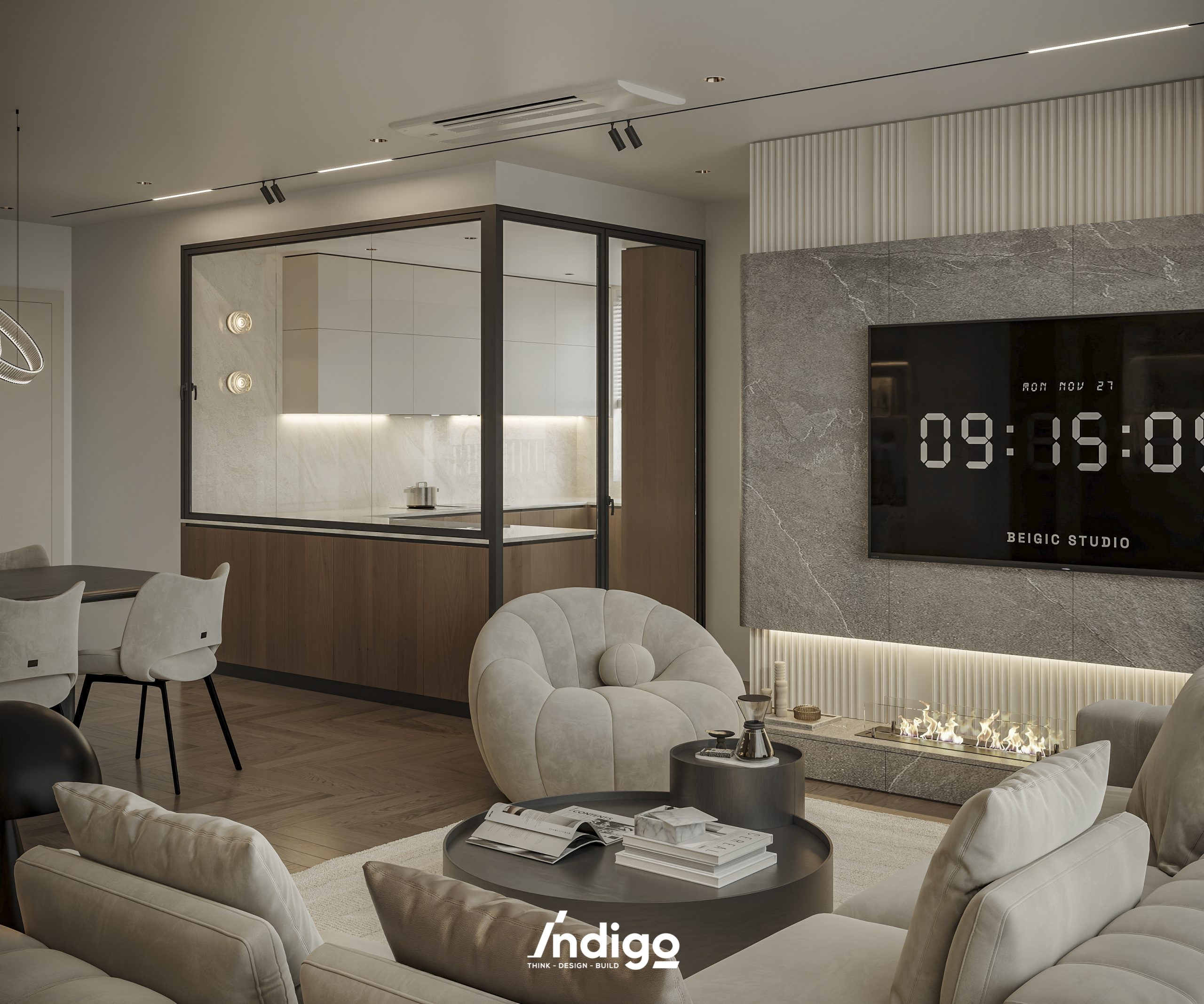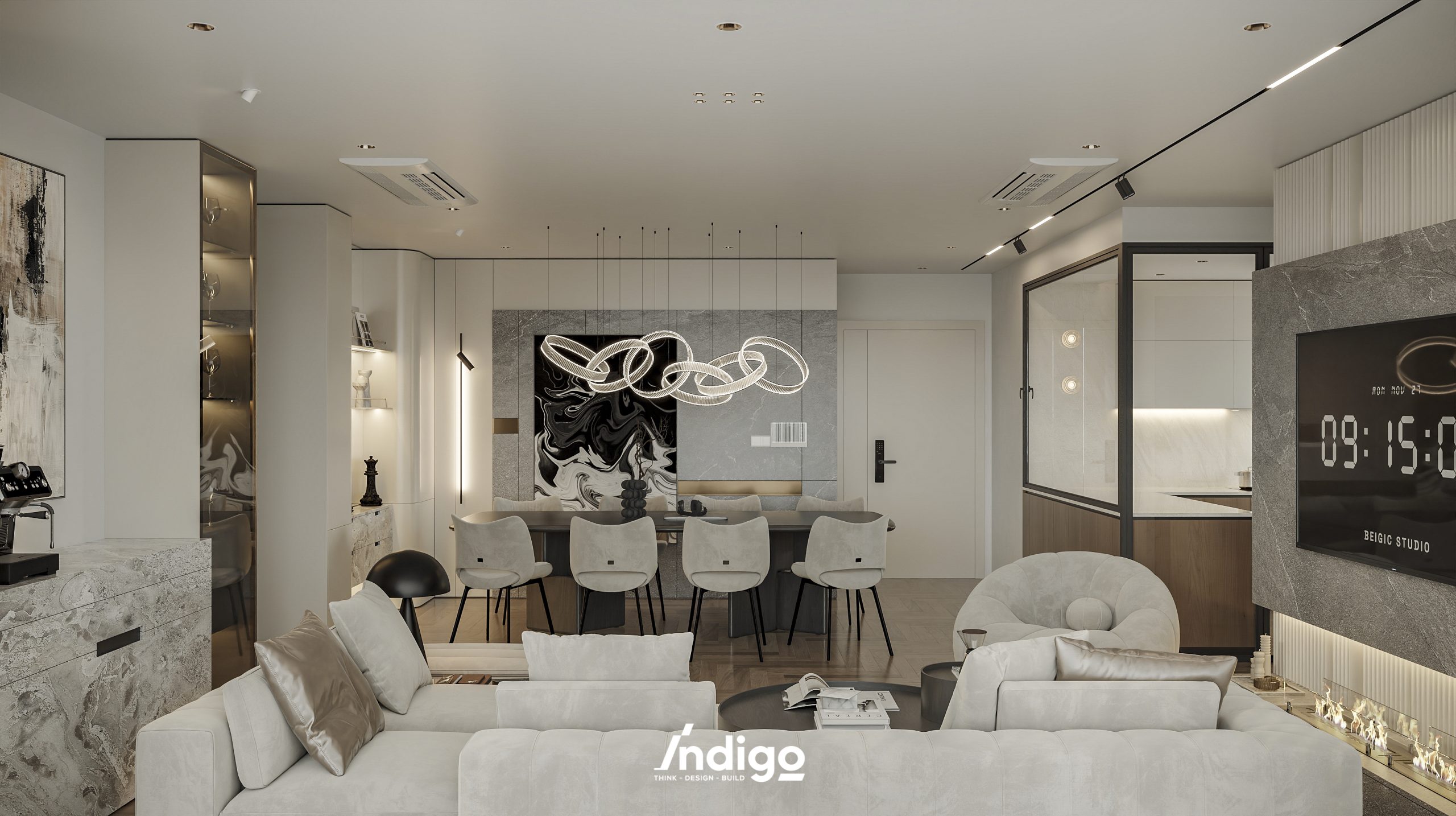 Một không gian sống hoàn chỉnh mang bầu không khí vừa riêng tư, vừa cởi mở. Màu trung tính kết hợp be nhám, đen than với điểm nhấn kim loại, da và gỗ tạo cảm giác tĩnh tâm, thư thái.